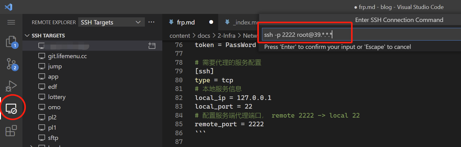 如上设置运行,可在任意机器上,通过 ssh -p 2222 root@39.*.*.* 登录内网机器。