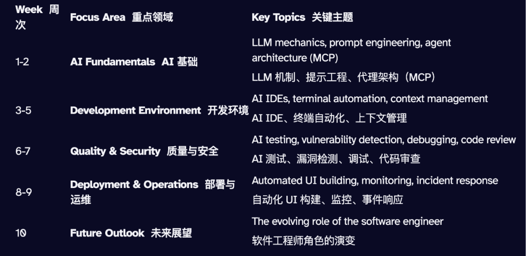 最近常听到一句话,AI不会替代你,但熟练使用AI的人可以轻松干废你。 初听有点儿耸人听闻,实际却在发生中.... 甚至斯坦福大学最近也开设了CS146S课程, 要求必须使用AI完成开发任务,作业是提交完成开发任务的提示词prompt。专门教授如何将大模型和AI工具(如编程智能体、AI IDE)集成到软件开发流程中,从而大幅提升开发者的生产力,并探讨了现代软件工程师的角色演变。课程大纲如下: