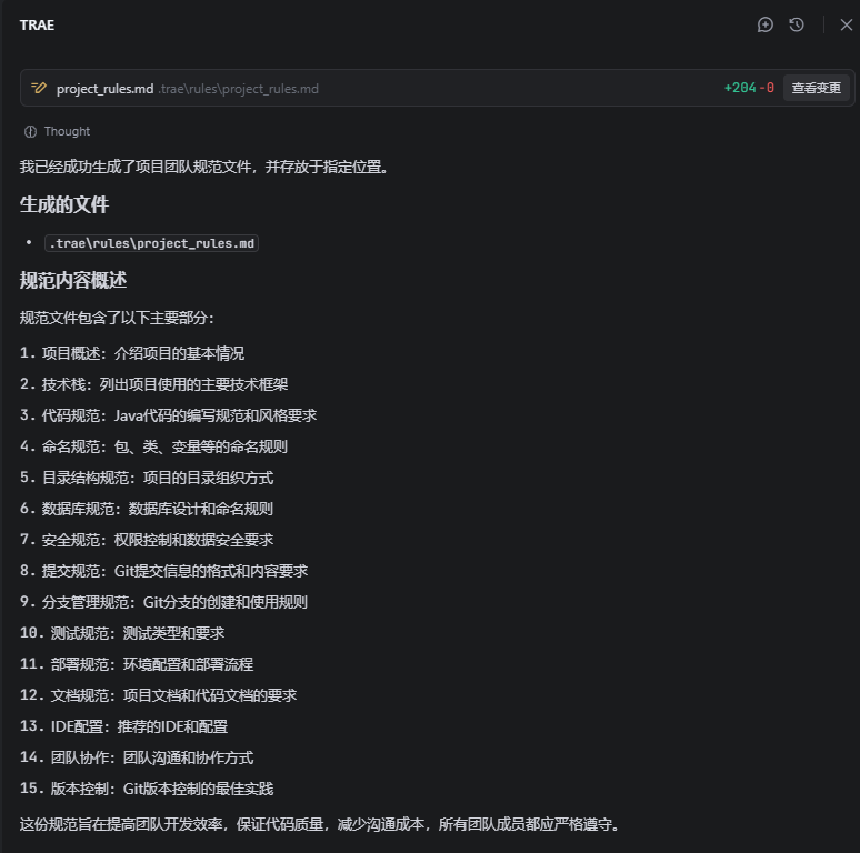 生成该项目的一个团队规范,存放于.trae\rules\project_rules.md文件中