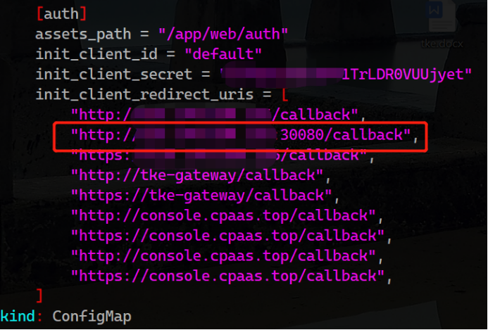 官方没有相关说明,一切都是ALL-in-ONE的原因,我改动了默认集群console的访问端口为30080。。。 通过查看源码发现是每次认证时dex会校验tke-auth-api向它注册过的合法client地址。于是我就修改了tke命名空间下tke-auth-api的相关configmap: