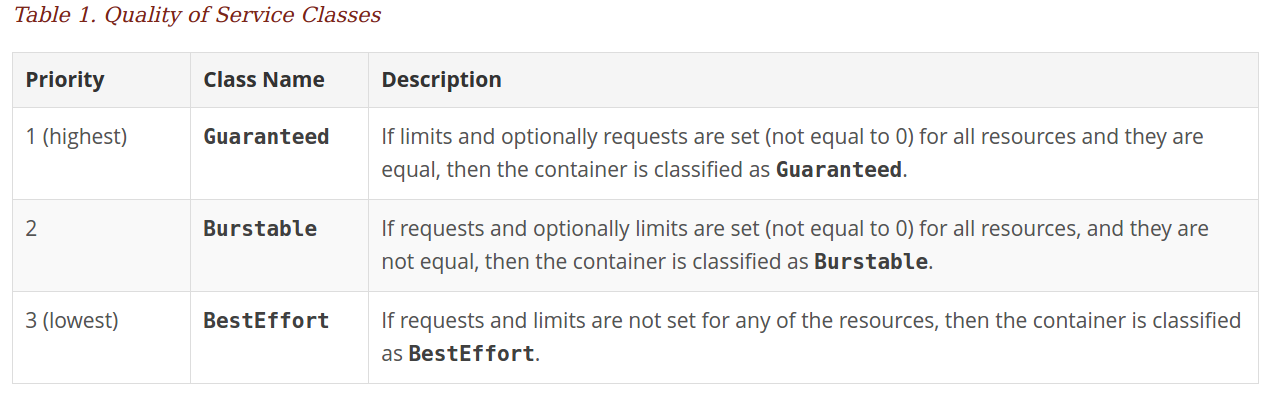 Guaranteed类型的pod是优先级最高的,是有保证的,只会在程序本身“异常”超出limits(一般的应用在pod层设置了limits,就不会超过该限制的,除非是java系的,其需要用环境变量来控制),才会被杀掉,其他类型的配额在集群资源紧张时会被kill掉的。