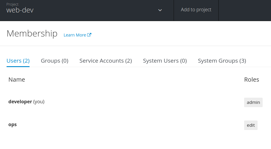 #假设一个叫ops的人负责上线,那首先ops得有具备web-dev项目里编辑is的能力 oc login -u developer #不该给ops这么高权限的,应该自定义一个只能tag is的role,这里为了简单演示 oc policy add-role-to-user edit ops -n web-dev如上操纵,ops就具备了tag web-dev项目的镜像的能力,也可以通过UI来查看和授权